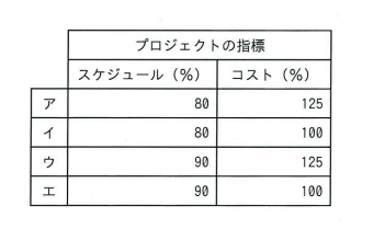 計画時の予算が2,000万円で,40日間で100本のプログラムを作成するプロジェクトがある。プロジェクトが20日経過した時点で全体の40%である40本のプログラムが完成し,1,000万円のコストが掛かった。プロジェクトの指標を次の評価式で算出する場合,プロジェクトの指標として適切な組合せはどれか。ここで,各プログラムの作成に必要な日数及びコストは全て同一で,プロジェクト期間中は常に同じ量の作業が実施されるものとする。