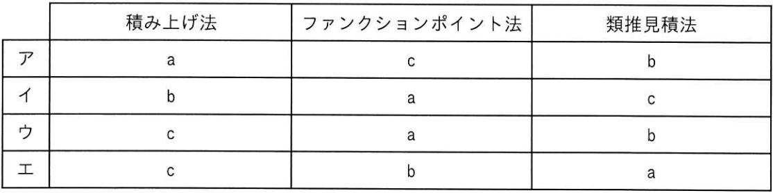 積み上げ法が「a」、ファンクションポイント法が「c」、類推見積法が「b」となっており、各手法の特徴と一致します。