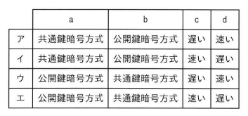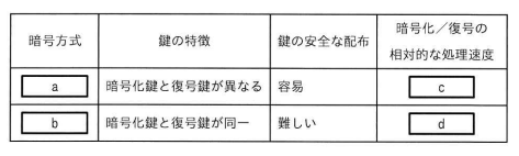 暗号化方式の特徴について記した表において,表中のa~dに入れる字句の適切な組合せはどれか。