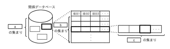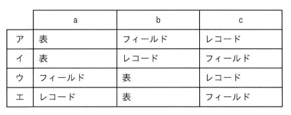 関係データベースを構成する要素の関係を表す図において,図中のa~cに入れる字句の適切な組合せはどれか。
