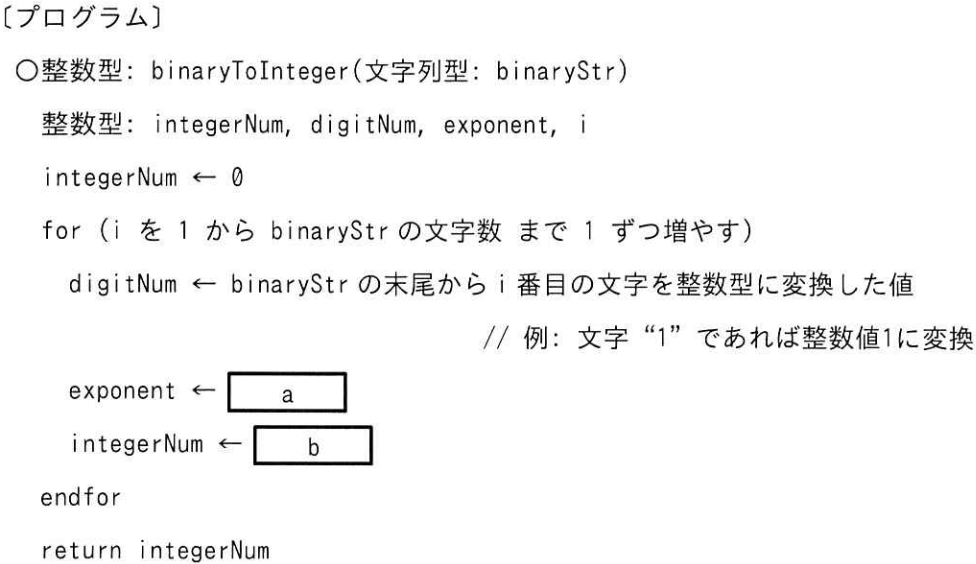 関数binaryToIntegerは,1桁以上の符号なし2進数を文字列で表した値を引数binaryStrで受け取り,その値を整数に変換した結果を戻り値とする。例えば,引数として“100”を受け取ると,4を返す。プログラム中のa,bに入れる字句の適切な組合せはどれか。