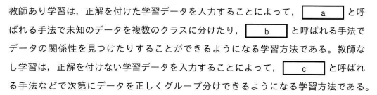AIにおける機械学習の学習方法に関する次の記述中のa~cに入れる字句の適切な組合せはどれか。