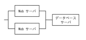 図に示す2台のWebサーバと1台のデータベースサーバから成るWebシステムがある。Webサーバの稼働率はともに0.8とし,データベースサーバの稼慟率は0. 9とすると,このシステムの小数第3位を四捨五入した稼働率は幾らか。ここで,2台のWebサーバ のうち少なくとも1台が稼働していて,かつ,データベースサーバが稼働していれば,システムとしては稼働しているとみなす。また,それぞれのサーバはランダムに故障が起こるものとする。