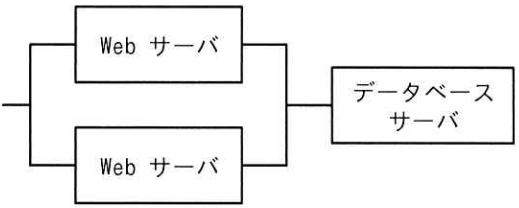 図に示す2台のWebサーバと1台のデータベースサーバから成るWebシステムがある。Webサーバの稼働率はともに0.8とし,データベースサーバの稼働率は0.9とすると,このシステムの小数第3位を四捨五入した稼働率は幾らか。ここで,2台のWebサーバ のうち少なくとも1台が稼働していて,かつ,データベースサーバが稼働していれば,システムとしては稼働しているとみなす。また,それぞれのサーバはランダムに故障が起こるものとする。