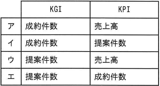 KGIは最終目標の達成度を数値で評価する指標です。KPIはKGIを達成するための活動や途中経過の達成度を数値で評価する指標です。本問では「成約件数を増やす」が最終目標なのでKGIは成約件数です。「企画を顧客に提案する活動」をどれだけ行えたかが途中経過なのでKPIは提案件数です。