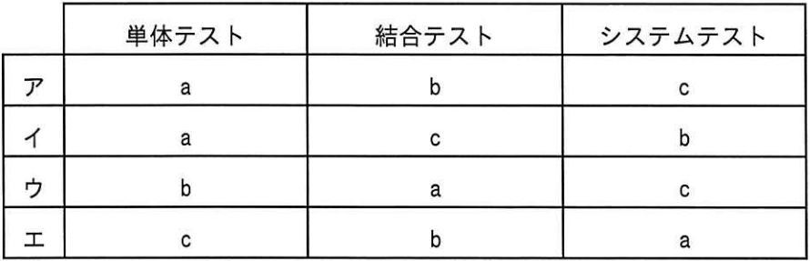 ソフトウェア開発における,テストに関する記述a~cとテスト工程の適切な組合せはどれか。