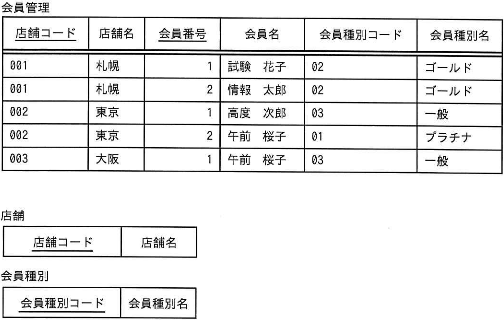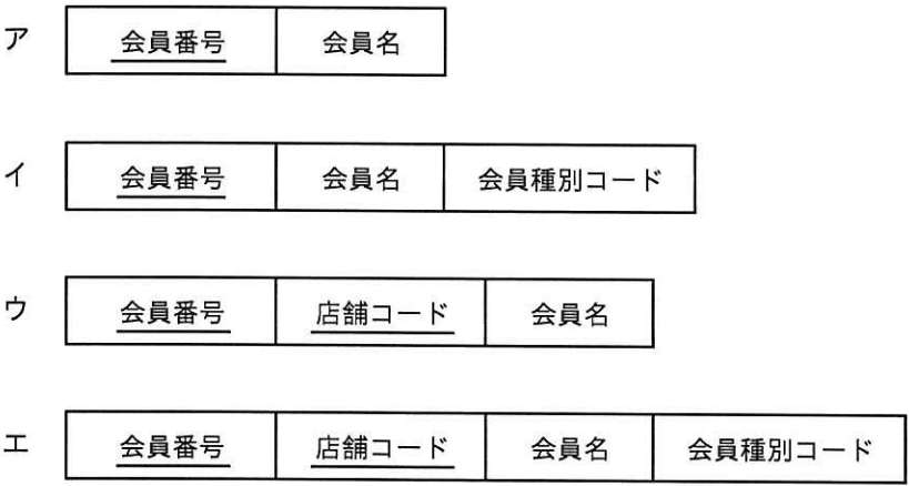 関係データベースで管理された“会員管理”表を正規化して,“店舗”表,“会員種別”表及び“会員”表に分割した。“会員”表として,適切なものはどれか。ここで,表中の下線は主キーを表し,一人の会員が複数の店舗に登録した場合は,会員番号を店舗ごとに付与するものとする。