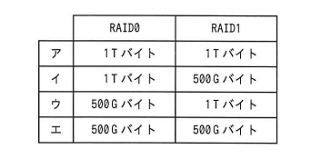 容量が500GバイトのHDDを2台使用して,RAID0,RAID1を構成したとき,実際に利用可能な記憶容量の組合せとして,適切なものはどれか。