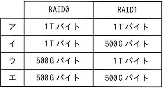 この問題では、2台のHDD(各500Gバイト)をRAID0、RAID1にしたときの利用可能容量を計算します。