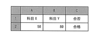 表計算ソフトを用いて,二つの科目X,Yの点数を評価して合否を判定する。それぞれの点数はワークシートのセルA2,B2に入力する。合格判定条件(1)又は(2)に該当するときはセルC2に“合格”,それ以外のときは“不合格”を表示する。セル C2に入力する式はどれか。