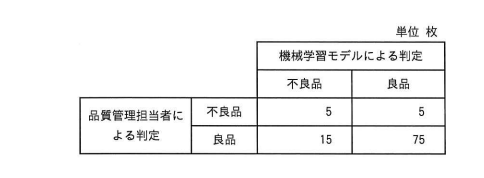 品質管理担当者が行っている検査を自動化することを考えた。10,000枚の製品画像と,それに対する品質管理担当者による不良品かどうかの判定結果を学習データとして与えることによって,製品が不良品かどうかを判定する機械学習モデルを構築した。100枚の製品画像に対してテストを行った結果は表のとおりである。品質管理担当者が不良品と判定した製品画像数に占める,機械学習モデルの判定が不良品と判定した製品画像数の割合を再現率としたとき,このテストにおける再現率は幾らか。