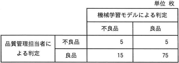 | 実際(品質管理担当者)\予測(モデル) | 不良品 | 良品 |