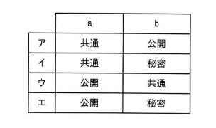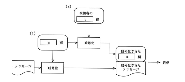 ハイブリッド暗号方式を用いてメッセージを送信したい。メッセージと復号用の鍵の暗号化手順を表した図において,メッセージの暗号化に使用する鍵を(1)とし,(1)の暗号化に使用する鍵を(2)としたとき,図のa,bに入れる字句の適切な組合せはどれか。