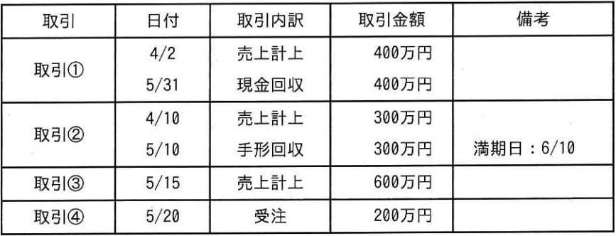 | 取引① | 売上計上400万円、5/31現金回収400万円 | 回収済み | 0万円 |