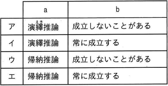問題文の「個々の事例を基にして、事例に共通する規則を得る方法」は、個別の観察結果から一般的な規則を作る帰納推論です。帰納推論で得られた規則は、観察した範囲からの一般化なので、例外があり得て成立しないことがあります。したがって、aは帰納推論、bは成立しないことがあるとなり、正解は「ウ」です。