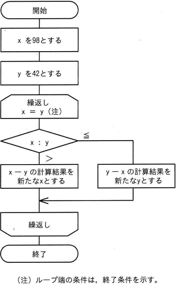 流れ図は、x=98、y=42から開始し、x=yになるまで繰り返します。各繰返しでxとyを比較し、x>yならx=x-y、そうでなければy=y-xに更新します。順に値を追うと最終的にx=y=14となるため、処理終了時のXは14です。