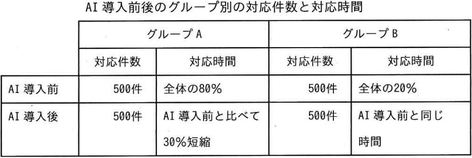 あるコールセンタでは,顧客からの電話による問合せに対応するオペレータを支援するシステムとして,顧客とオペレータの会話の音声を認識し,顧客の問合せに対する回答の候補をオペレータのPCの画面に表示するAIを導入した。1日の対応件数は1,000件であり,問合せ内容によって二つのグループA,Bに分けた。AI導入前後の各グループの対応件数,対応時間が表のとおりであるとき,AI導入後に,1日分の1,000件に対応する時間は何%短縮できたか。
