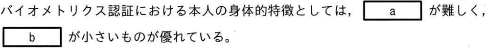 バイオメトリクス認証に使う身体的特徴は、他人になりすまされにくいことと、長期間使っても特徴が変わりにくいことが重要です。そのため、aは「偽造」が難しい、bは「経年変化」が小さいが適切であり、正解はアです。
