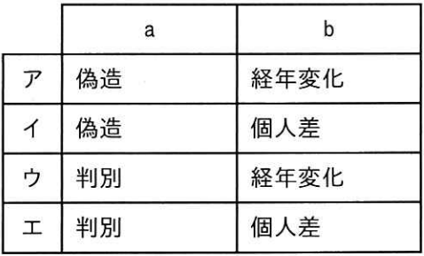 aが偽造、bが経年変化の組合せを選ぶため、正解は「ア」です。