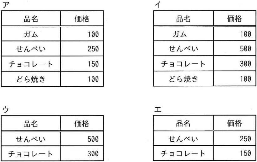結果は、せんべい, 250 と チョコレート, 150 の2行になり、選択肢「エ」と一致します。