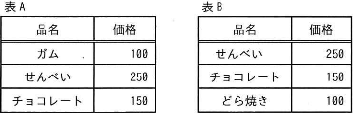 表Aと表Bに共通して存在する行(せんべい,250 と チョコレート,150)だけを取り出しており、積集合の結果です。