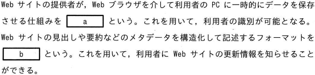 Webブラウザを介して利用者のPCに一時的にデータを保存し、再訪問時などに利用者を識別する仕組みはcookieです。Webサイトの見出しや要約などのメタデータを構造化して記述し、更新情報を利用者に知らせるためのフォーマットはRSSです。aがcookie、bがRSSの組合せを選びます。